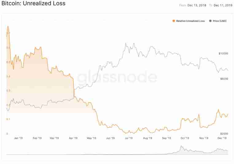 通过查看、创建UTXO时的价格与现价之间的差距,我们可以确定该UTXO中的比特币是处于未实现利润(价格上升),还是处于未实现损失(价格下降)的状态,未实现损失表示在价格比现价更高时所创建的UTXO的应计总利润。