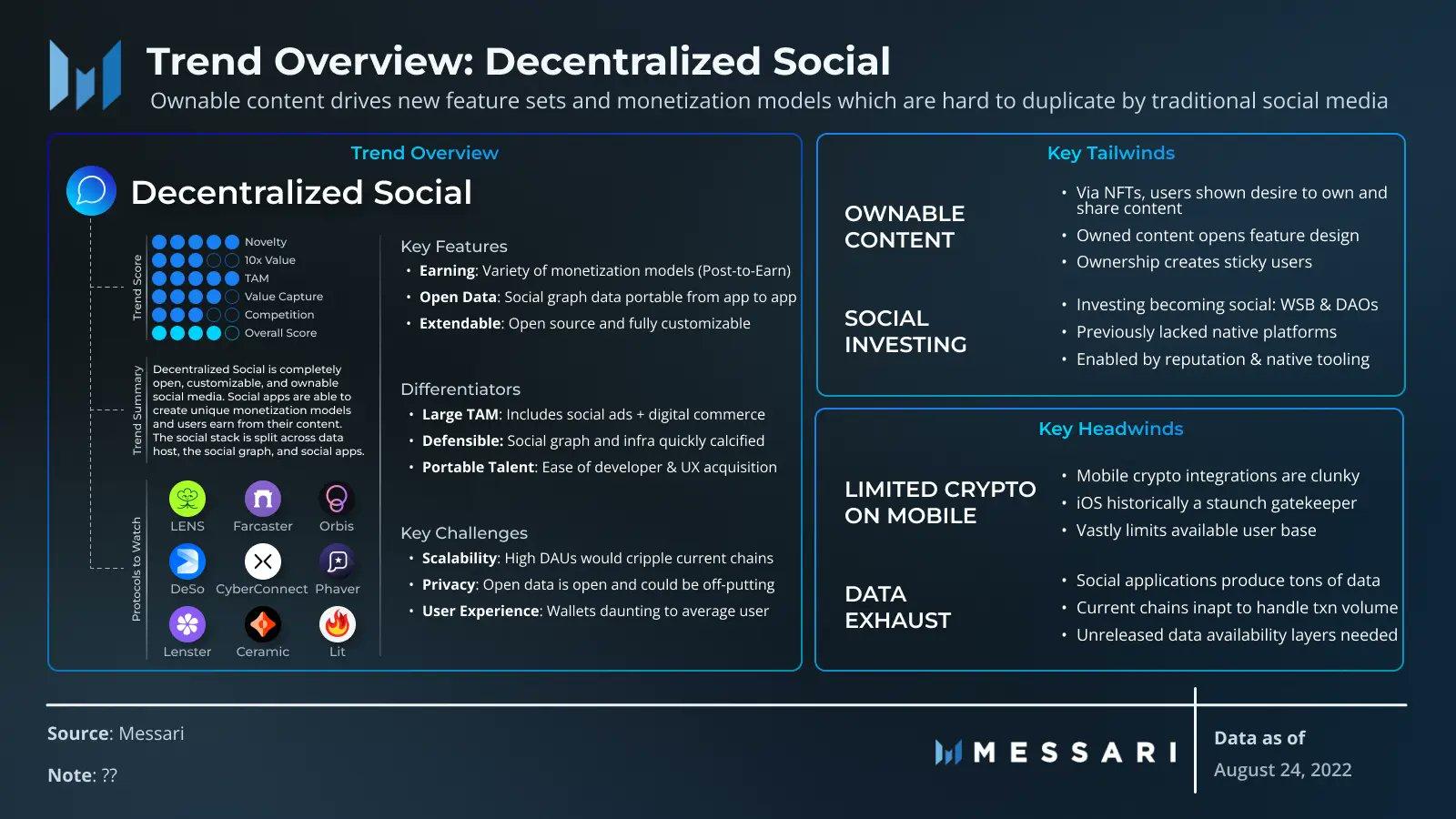 去中心化社交为人们提供链上声誉、组织 (DAO) 和内容所有权,其中内容所有权是关键,因为它为人们提供了一种最终获取自己创造价值的方式,这意味着互联网将重新构建价值流。