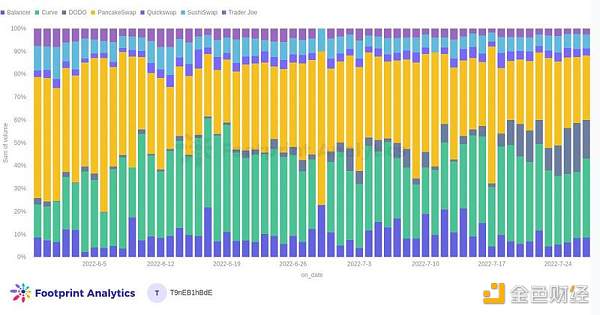Footprint Analytics -A chart showing a basket of 7 DEXs and their share of trading volume.