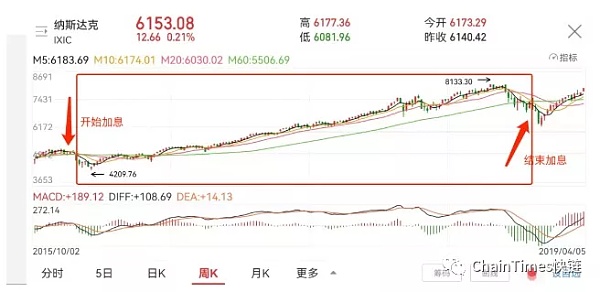 1)、第一次加息是在1999年6月到2000年5月,基准利率从4.75%上调到6.5%。1999年GDP强劲增长、失业率降至4%。美联储将利率下调75个基点以应对亚洲金融危机后,互联网热潮令IT投资增长,经济出现过热,互联网泡沫严重,美联储此时选择收紧货币,将利率从4.75%经过6次上调至6.5%。开始加息后纳斯达克依旧持续走高,加息期间涨幅甚至翻倍。