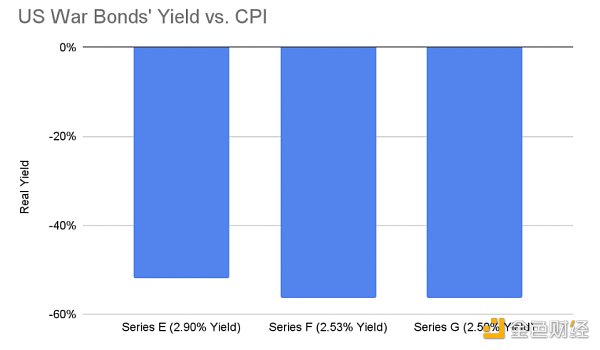 战争债券是一项好的投资吗?这取决于你对「好」的定义。如果您所说的「好」是指债券持有人获得的收入超过了通货膨胀,那么让下图来反驳任何认为这些是「好」投资的观点。