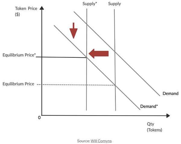 该图反映了由于协议收入减少,代币需求向内转移。因此,一部分投资者解押他们的代币进行出售。在解除质押的过程中,他们的一部分代币被烧毁。燃烧机制减少了总的代币供应,并使供应曲线左移,其结果是代币价格的下降幅度较小。