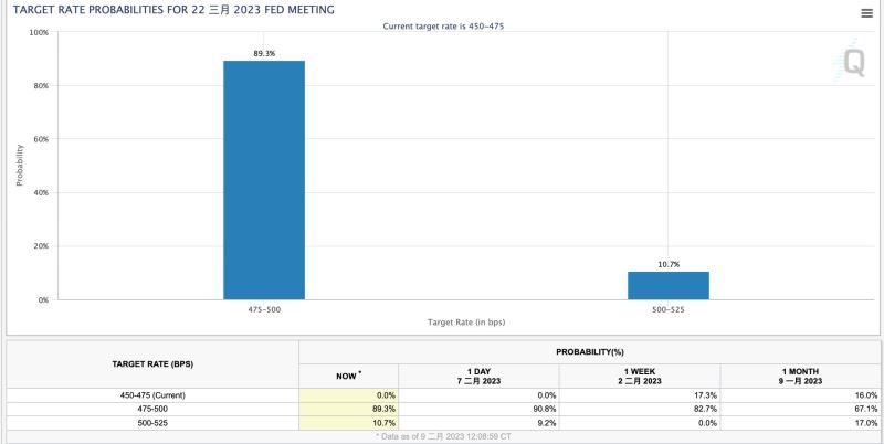 CMEFedWatch预测数据显示,目前市场预期联准会将在3月政策会议决议升息1码、将基准利率升至4.75–5.00%的机率为89.3%;升息2码的机率则有10.7%。