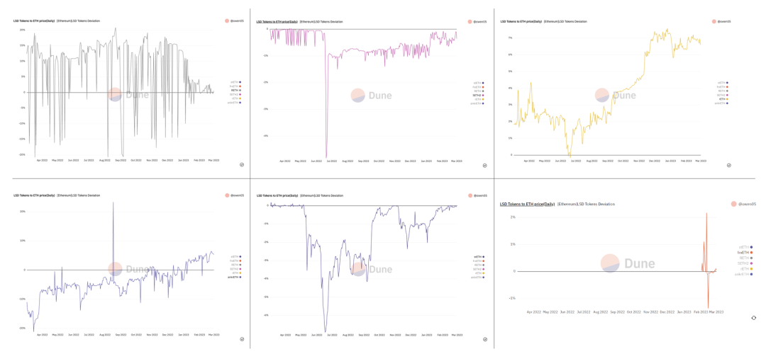 LSD 能不能锚定 ETH,是重要的表现指标,这决定了其能否被接入更广泛的 DeFi 协议,以及围绕其搭建的乐高的稳定性。LSD 对 ETH 的折价表现一方面反映市场信心,一方面反映 LSD 本身的稳定性。在上海升级后,LSD 可以在链上提取,自带套利机制,LSD 的价格波动都会得到很大改善。