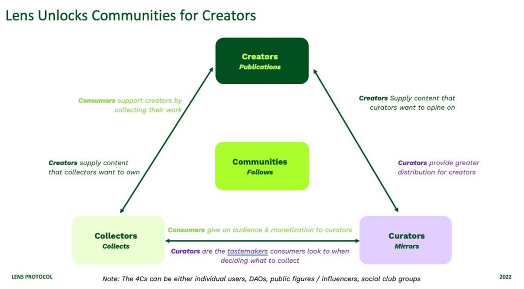 针对这一问题,Lens 试图通过打造以创作者为中心的社区模型来解决认知变现的问题,将原本割裂的创作者和消费者身份融合进社区中。